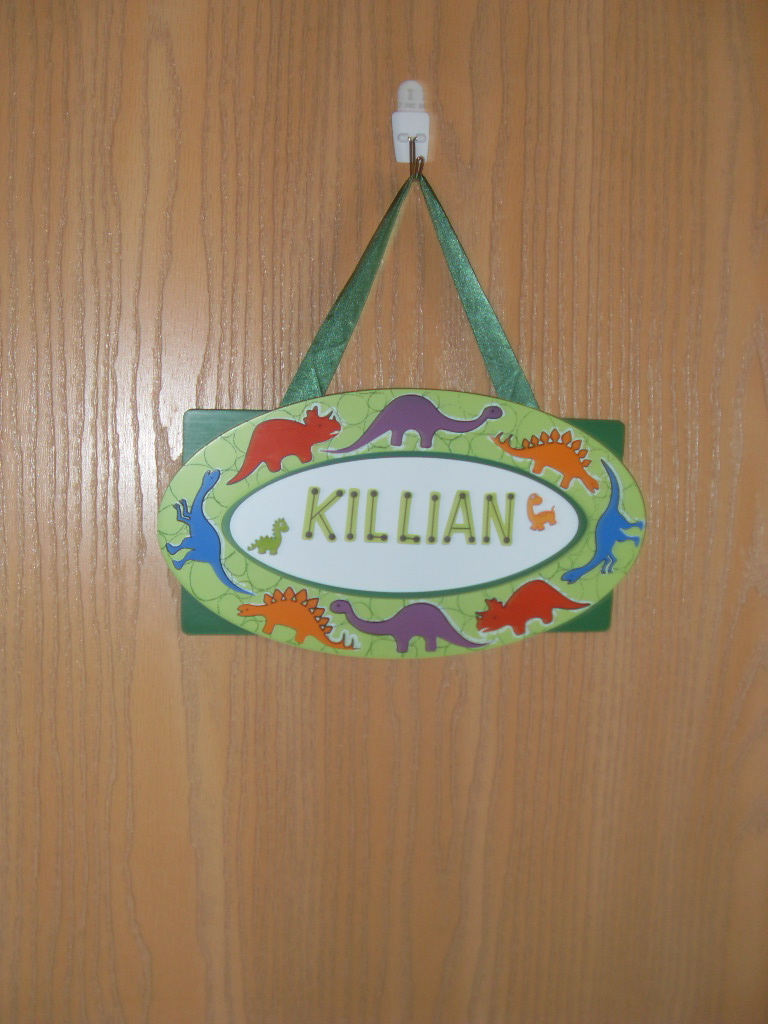I found this dino-name plaque off of craigslist.. but amazon sells them too (mellissa and doug)